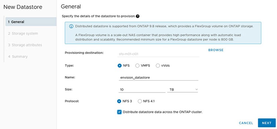 Next, select the underlying storage type. On ONTAP storage systems, NFS, VMFS on Fibre Channel (FC) or iSCSI, and vVols are supported as storage types. Click Next. In this example, we chose NFS as our storage type and NFSv3 as our protocol. If you want to create a NetApp FlexGroup volume, select the Distribute Datastore Across the ONTAP Cluster option. FlexGroup volumes can increase performance of volumes because their data is distributed across all nodes in the cluster, which increases the resources available for servicing the volume.